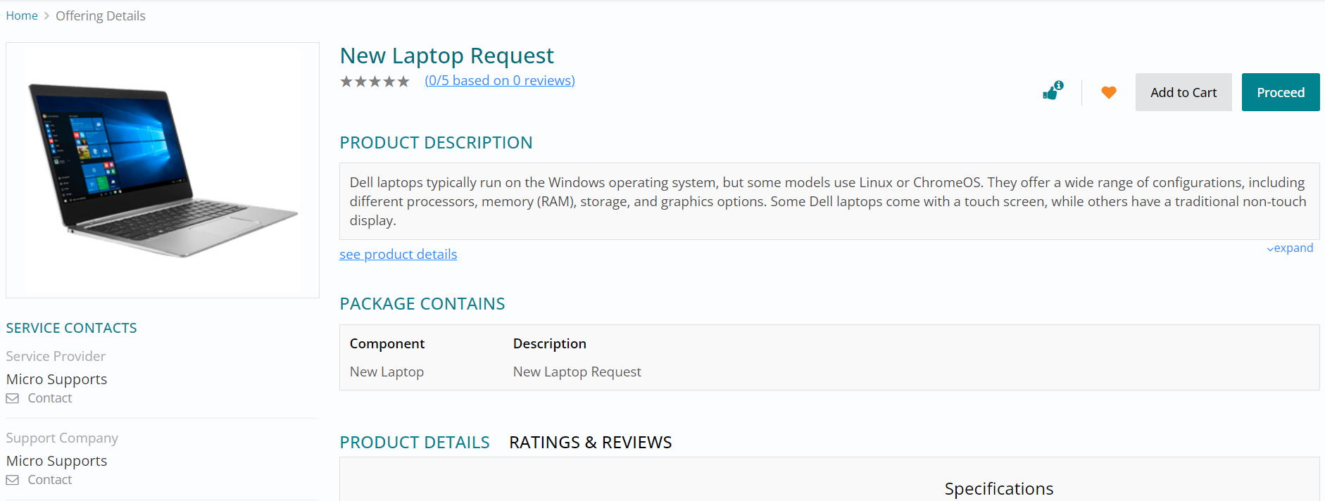 - You can view the offering details. The two options to the left of the Add to Cart and Proceed buttons indicate Approval Required (thumb with the information icon) and Add to Favourites (heart icon).