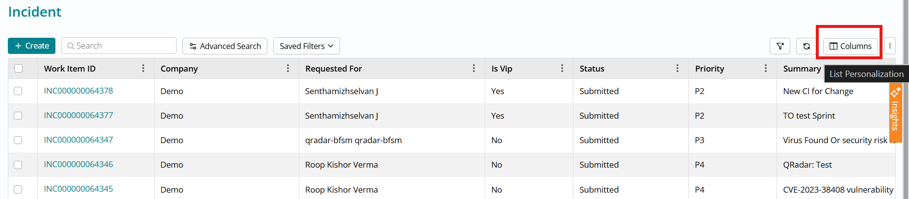 The "Is VIP" column can be added to list views for all three modules through standard list personalization using the column selector, enabling fulfillers to identify VIP requests at a glance when reviewing work queues.
