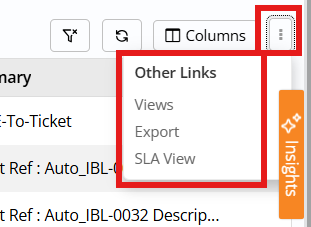 The same ellipse menu also exposes quick links: Export (download all records rendered on the page, currently without respecting filters), SLA View (navigate to SLA view for that module), Calendar View for Change and Appointment lists (plus a dedicated calendar icon on Change lists to launch the Change Calendar), and Reset Filters to clear all applied filters and return to the default list.