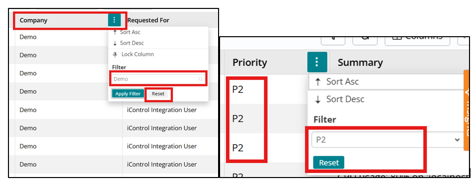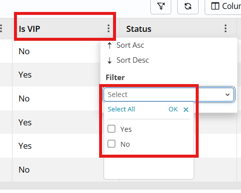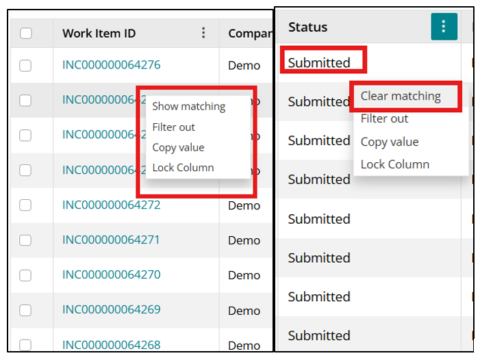 Per-column Context Menus and Column Filters give more granular control. Admins can enable a context menu icon per column from the Column configuration page under View; when enabled, users see a menu icon in that column header and can sort ascending/descending, Lock/Unlock Column to freeze it during horizontal scrolling (also governed by an “Is Locked” property), and use a right-click context menu on any cell to Show Matching/Clear Matching, Filter Out, Copy Value, or Lock Column.