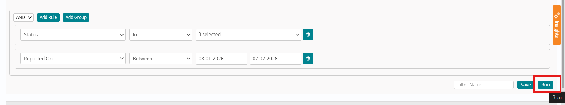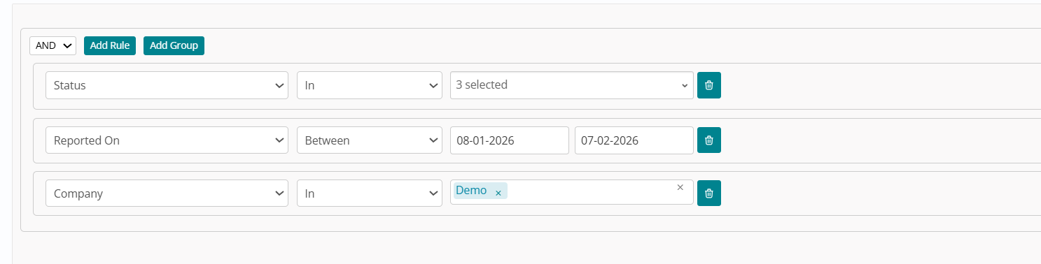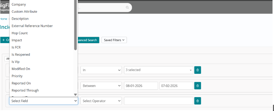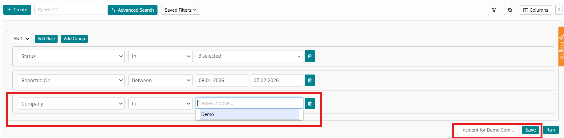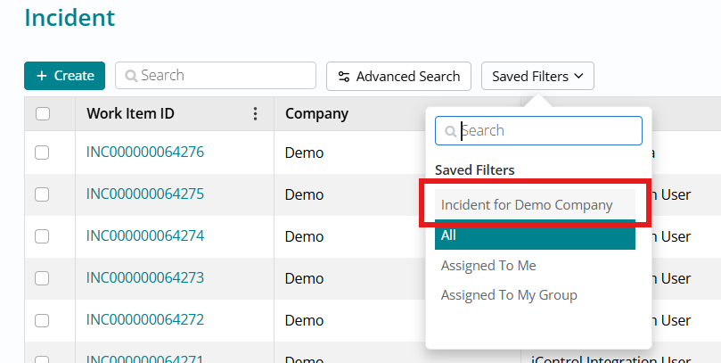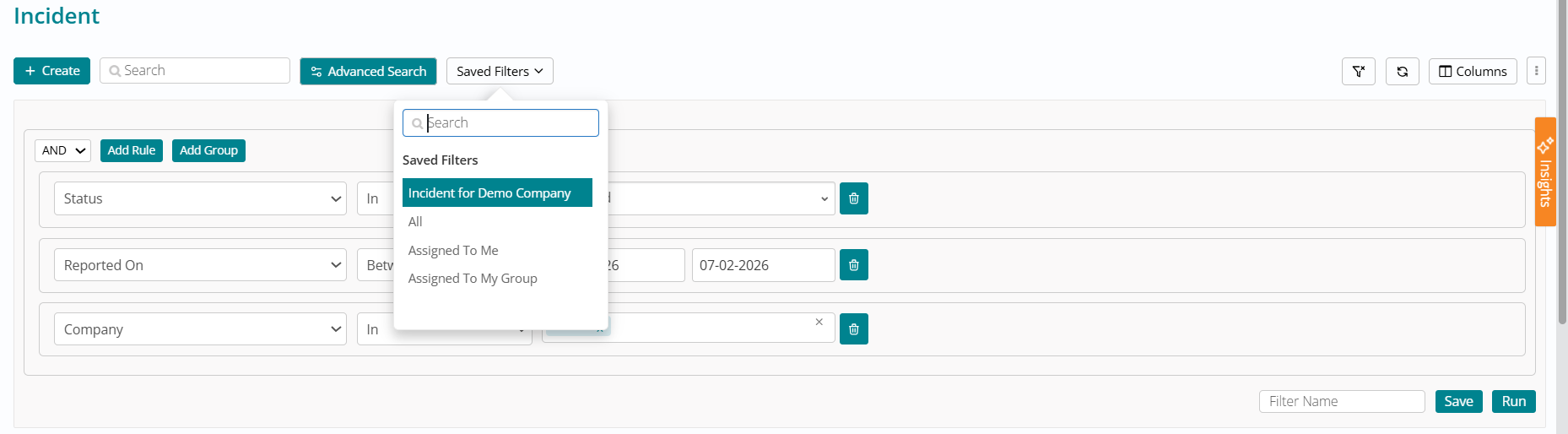 Users can modify or extend these rules, give the condition a Name, and click Save so it appears in the Saved Filters dropdown, or click Run to apply filters without saving. Saved filters can be selected (or searched) from the dropdown, immediately applying the condition; the same condition is visible again when reopening Advanced Search, and three default filters (All, Assigned to Me, Assigned to my Group) are always available, with data constrained by user access rather than role-based visibility on the filter names.