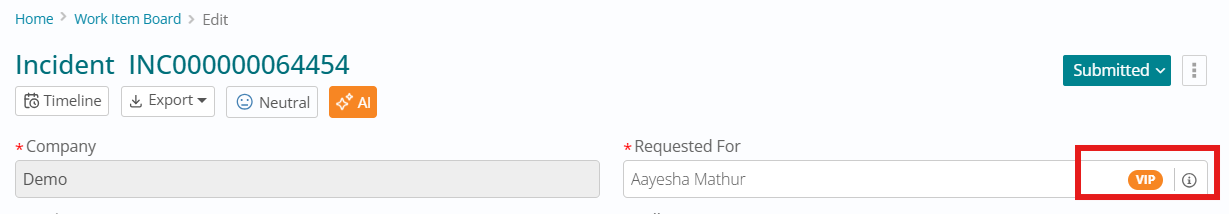 This enhancement enables immediate identification of VIP requestors, supports differentiated service delivery, facilitates compliance with VIP service level agreements, improves customer satisfaction for high-value users, enables VIP-specific reporting and analytics, supports automated VIP handling through rule-based workflows, and ensures consistent VIP treatment across all service channels.