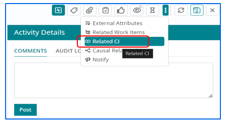 Support users can relate Configuration Item with Change Work Item whenever required by selecting Related CI from side panel.