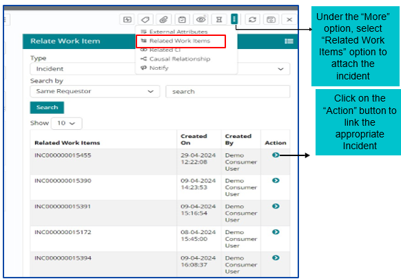 Search by – Item ID, Same Requester and Same Impacted CI. Click on Relate button to relate the work item.
