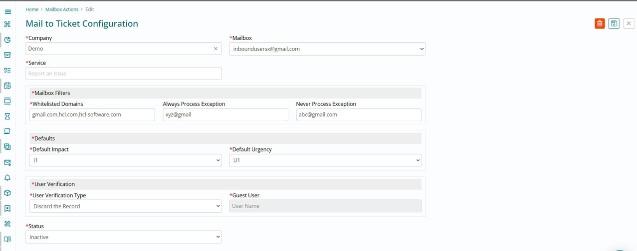 | Discarded | Status of record will change to "Discarded" when the mailbox configuration for that company is done accordingly |