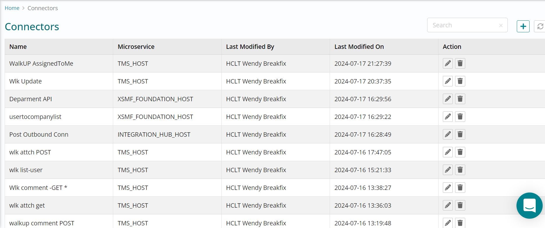 | Add | To create a new connector one can, click on the + icon on the connector list page and add the details to configure a connector. | Super Admin or App Admin role is required to perform this action. |