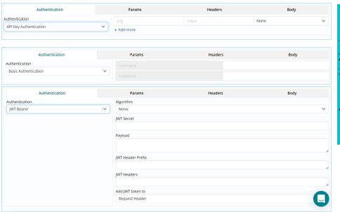 - JWT Bearer - Requires algorithm, JWT Secret Key, Payload, JWT Header Prefix, JWT Headers, Add JWT token to (Request Header/Query Param