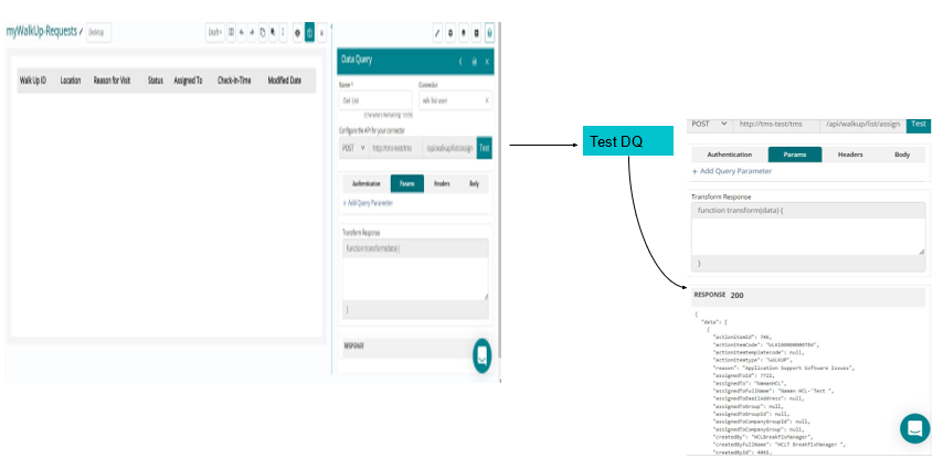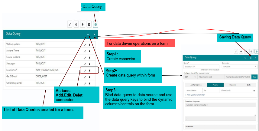 Data Query encapsulate the connector information within them. They are created at form level to conduct API related/data related actions.