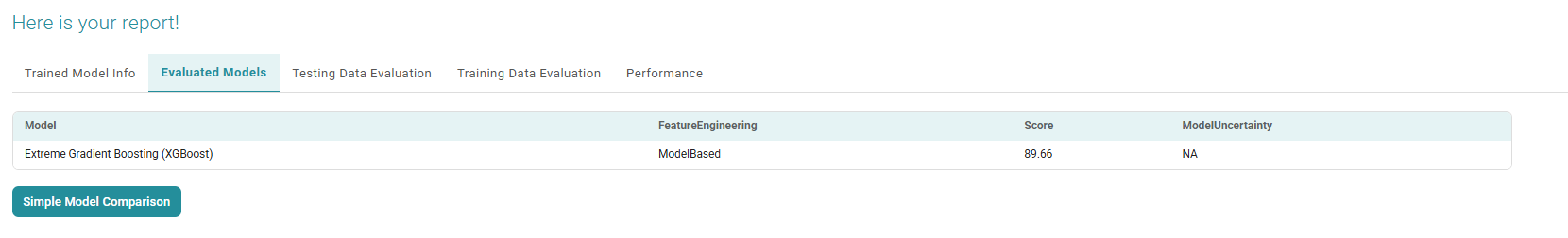 The performance of evaluated models is presented using metrics such as testing scores, Confidence Scores, and Feature Engineering Methods. The results of classification and regression models are benchmarked against basic models like logistic regression and linear regression, respectively. For instance, the performance of an Extreme Gradient Boosting (XGBoost) classification model would be compared to that of a logistic regression model.