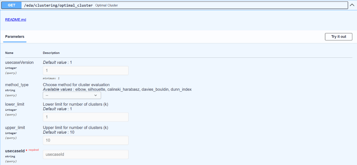 - method_type (string, optional: elbow, silhouette, calinski_harabasz, davies_bouldin, dunn_index)