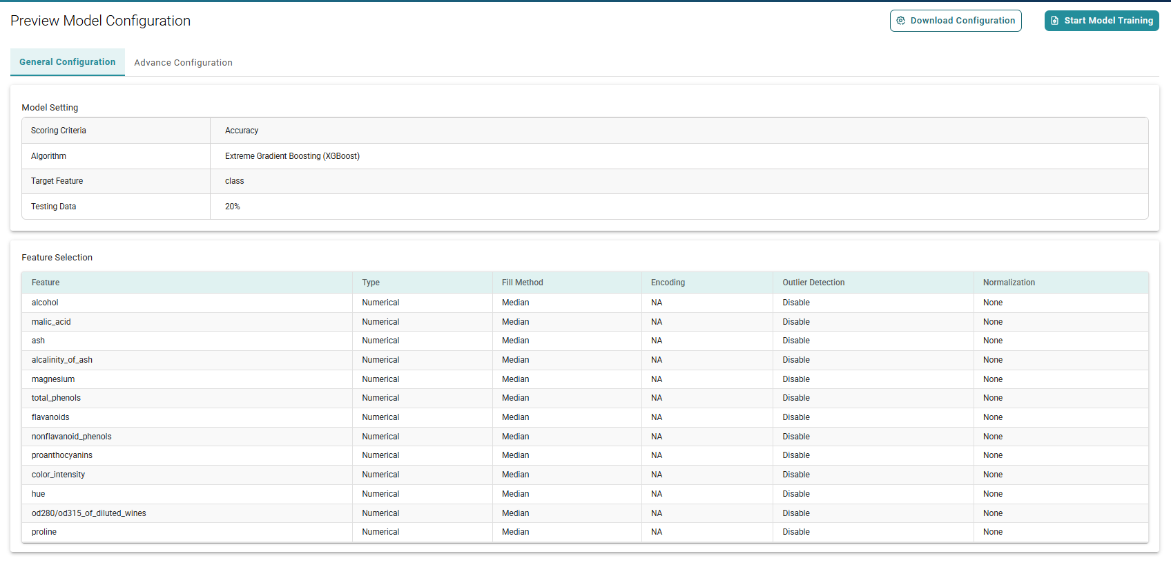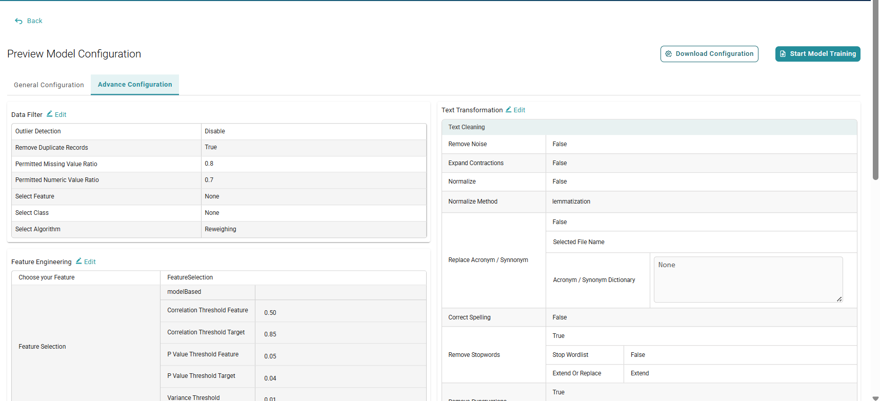 After selecting all the configurations for model training, a preview is displayed and can be downloaded as well.