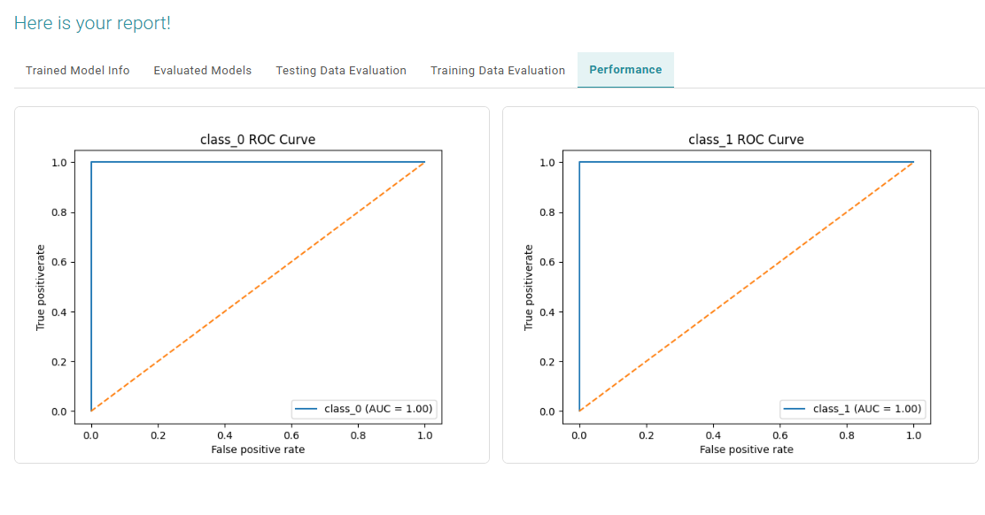 Performance The performance tab shows various graphs depending on the problem type, giving an idea about the model performance.