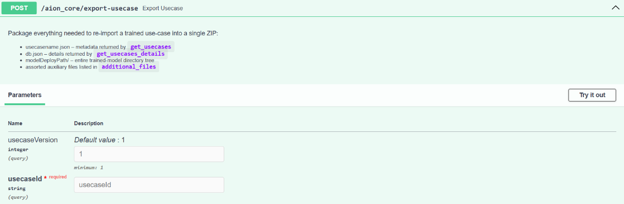 This API enables packaging of everything related to a trained use case into a single downloadable ZIP file. This ZIP includes configuration metadata, database details, model deployment folders, and any additional auxiliary files.
