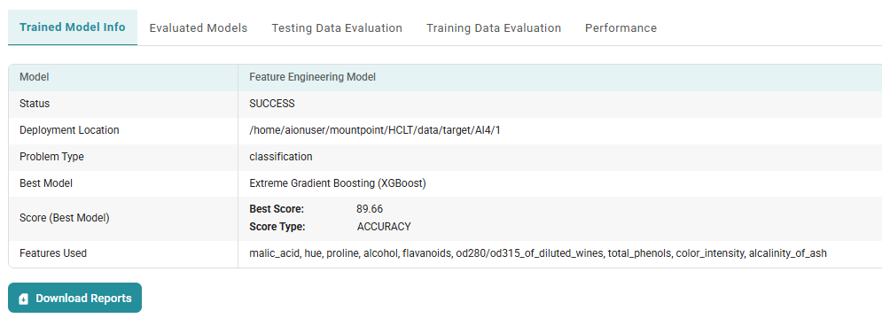 This tab provides information on training status, model deployment location, problem type, best model (if multiple algorithms were selected), best model score, and features used.