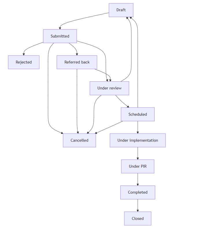 Once PIR is completed, status of Change Work Item Lifecycle moves to ‘Completed’.