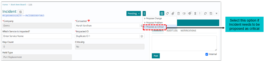An Incident can be proposed critical as per business impact. To propose the Incident, use below depicted option and click on “Propose as Critical”.