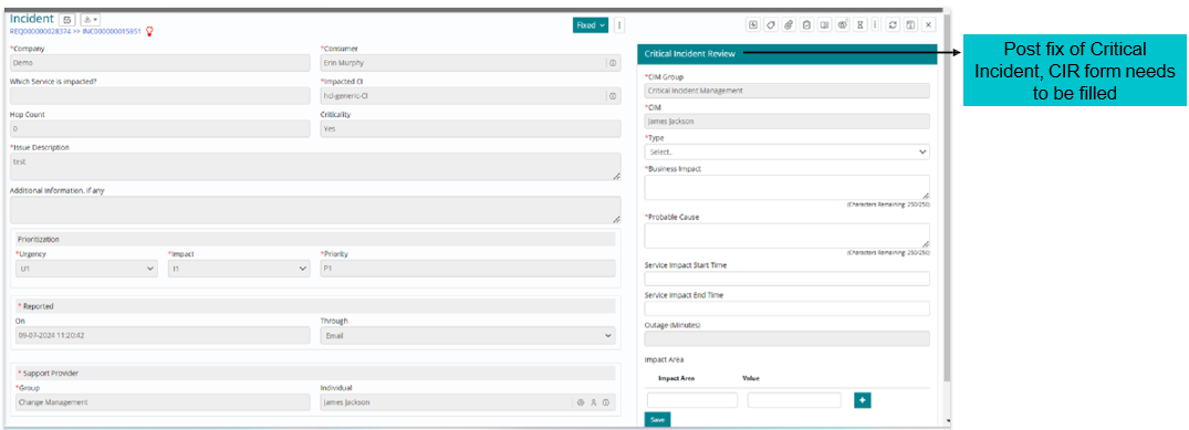 For an Incident that is accepted as a Critical Incident and a fix is provided, a “Critical Incident Review” (CIR) form needs to be filled as shown below.