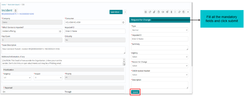 On selecting “Propose change” to raise an RFC via the Incident form, user needs to fill all mandatory fields and submit, this will create an RFC request. The created RFC will automatically get added as the related work item.