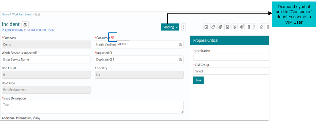 Any user who is configured as a VIP User/ Power user as per admin configurations, can be recognized with help of the diamond shaped icon alongside “Consumer” field.