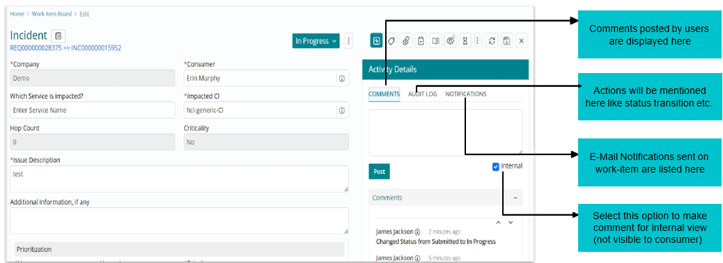 Activity details can be referred to in the section depicted below. New comments can also be posted using this section. Any comment which is not intended for consumer can be restricted and marked as “Internal”.