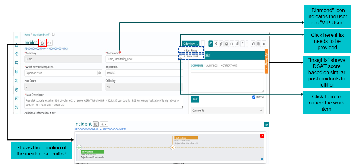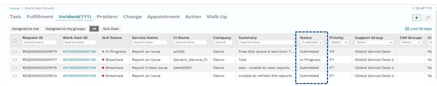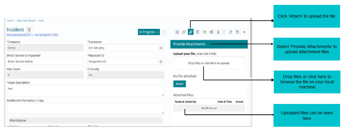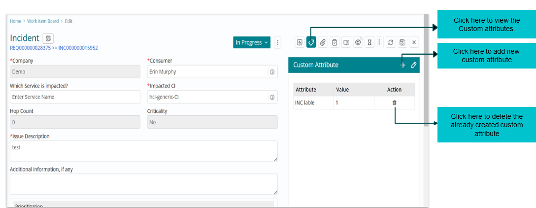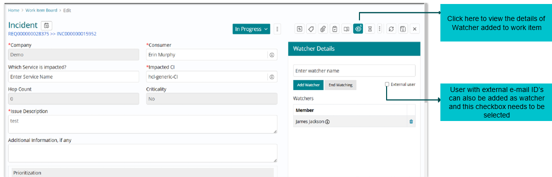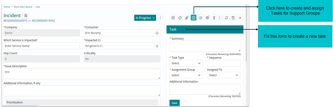 The status “In Progress” can be seen against the incident request listed on the Work Item board.