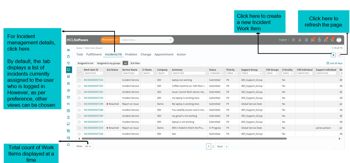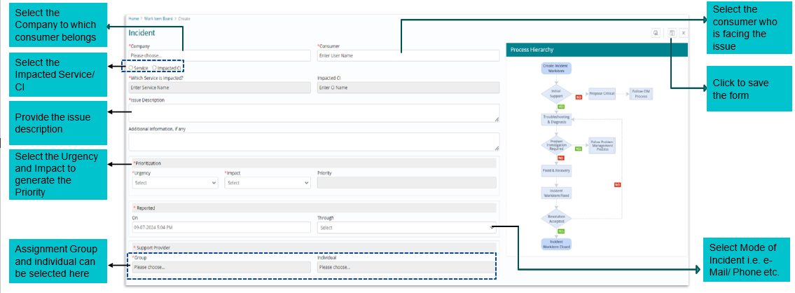 To create a New Incident – click the “+” icon on the right top corner of the Work Item Board. All mandatory fields need to be filled in the below form and saved.