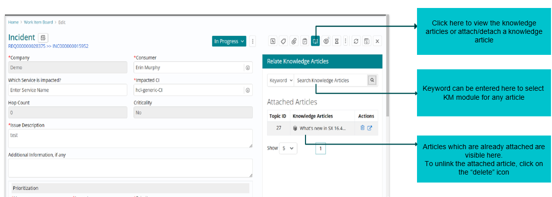Articles from Knowledge management can be searched from this option and can also be linked/ unlinked to the incident.