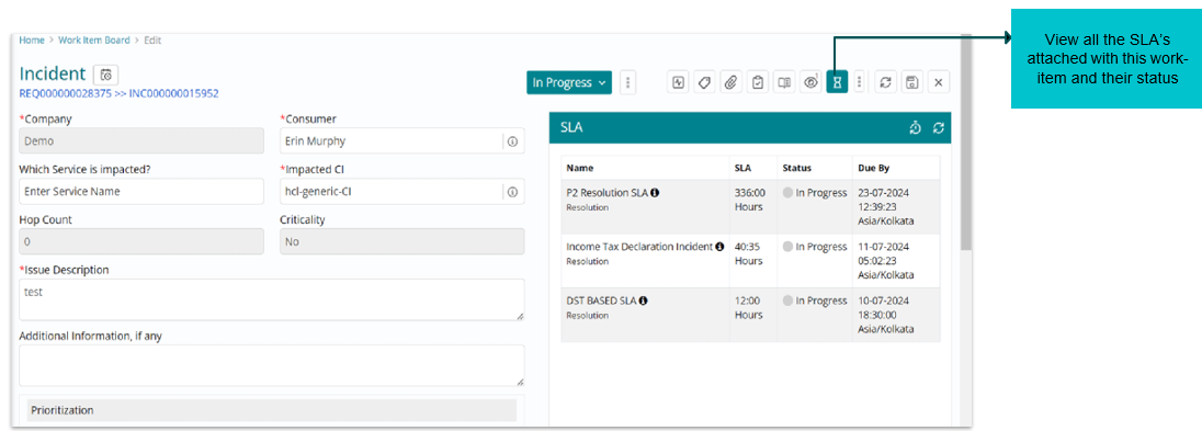 SLAs attached to the work item concerned are displayed along with their status (In Progress, Breached etc.)