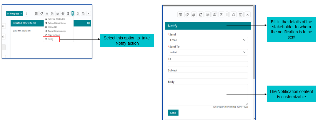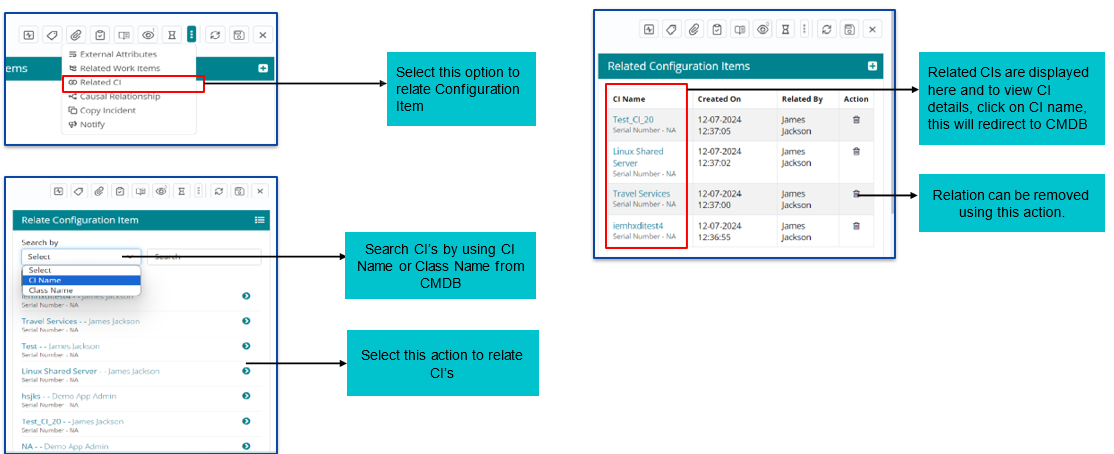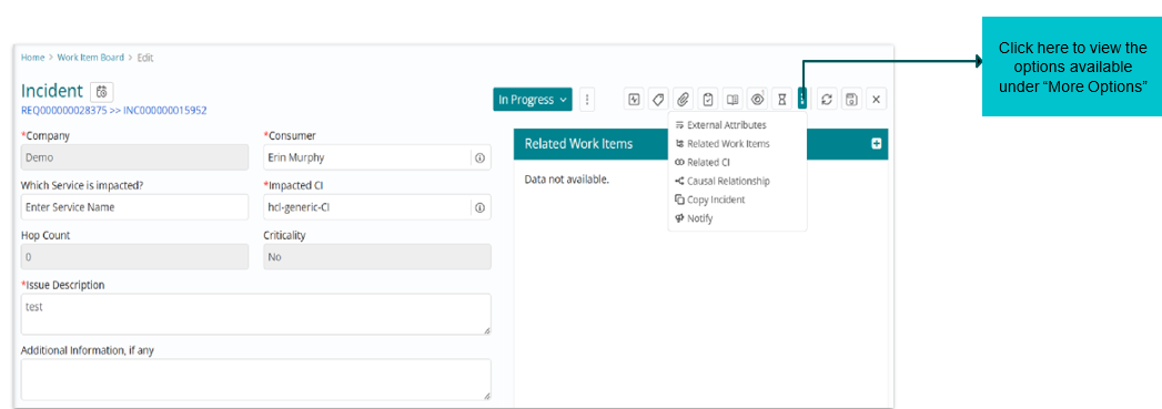 Configuration Items (CI’s) from CMDB can be also linked to Incidents. To link the CI’s, choose “Related CI” form the “More” option.