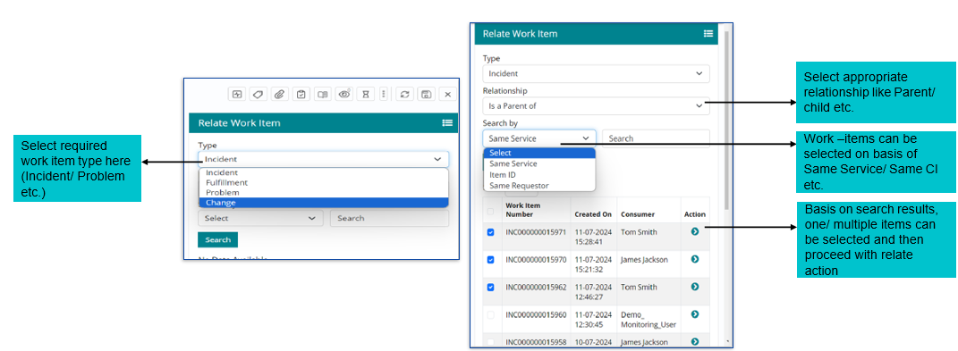 Other work items such as Problem, Change, Incidents can also be linked with Incidents with different type of relationships (parent/ child) using this option.