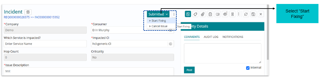 To initiate working on the incident “Start Fixing” option needs to be chosen, this will move the Incident in “In Progress” state.