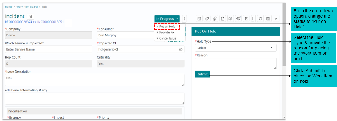 To put the Incident in “Pending” state, select the required hold type (vendor action/ awaiting information etc.) can be chosen and reason needs to be provided.