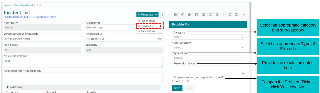 To resolve an Incident, click on “Provide Fix” and fill the required details as per the form available, also if required, problem ticket can be opened at this step.
