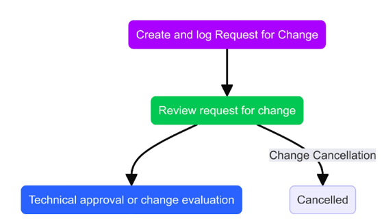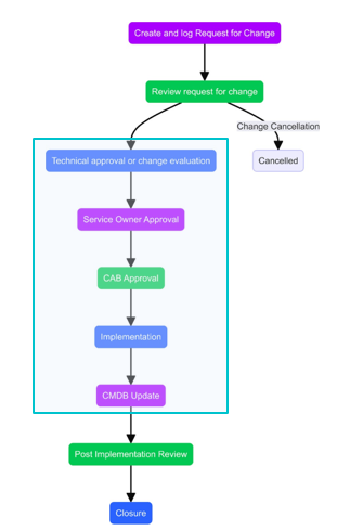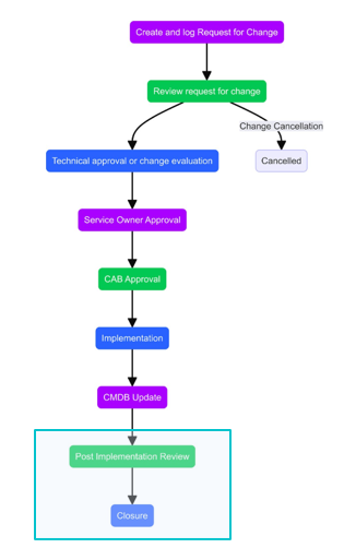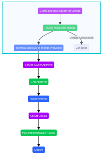 As soon as RFC (Request for Change) is created, it will be routed to the Change Management team and will be catered through the Change Management Process based on its priority.