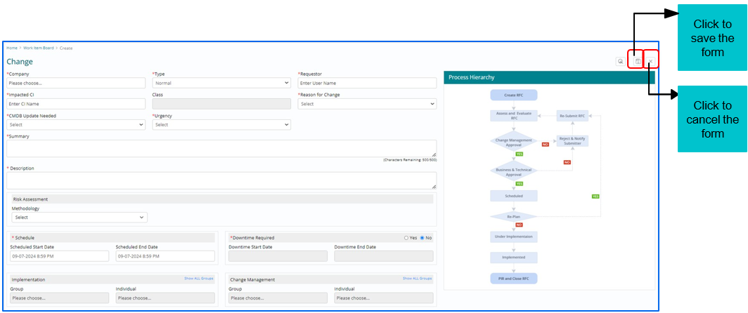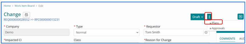Support users can relate Configuration Item with Change Work Item whenever required by selecting Related CI from side panel.