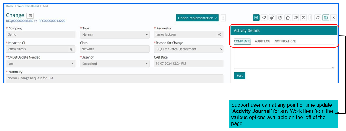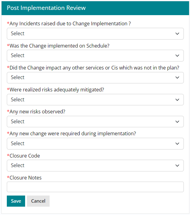 - Implemented: Once the Implementation plan is executed and Support user clicks on End Implementation lifecycle of a Change Work Item moves to ‘Implemented’.