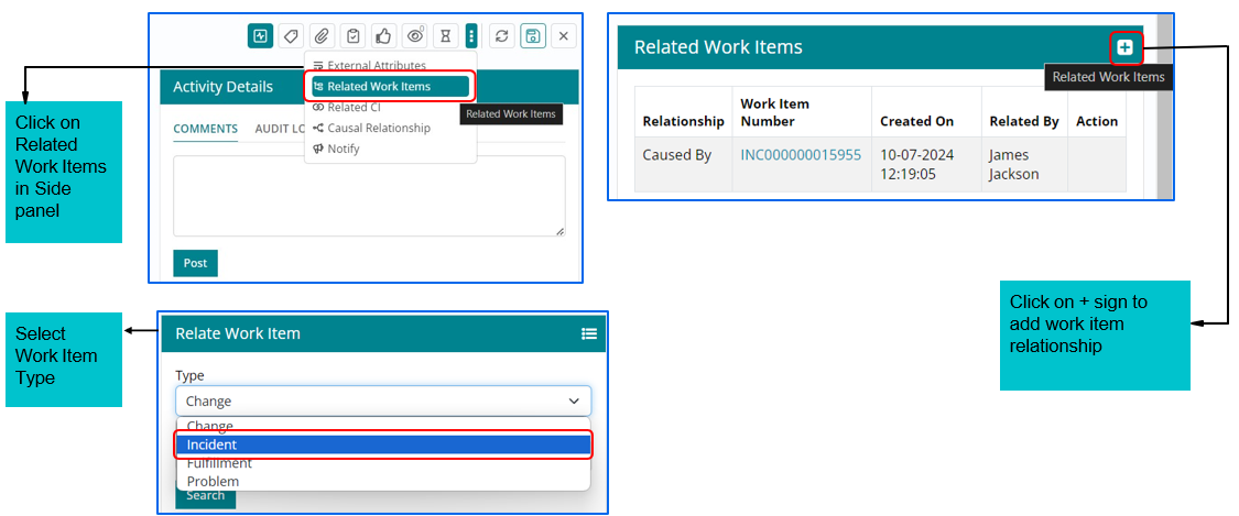 Support user can relate existing Change Work Items with Other Work Item if required based on work item Type such as Change, Incident, Fulfilment and Problem.