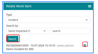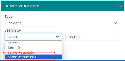 Search by – Item ID, Same Requester and Same Impacted CI. Click on Relate button to relate the work item.