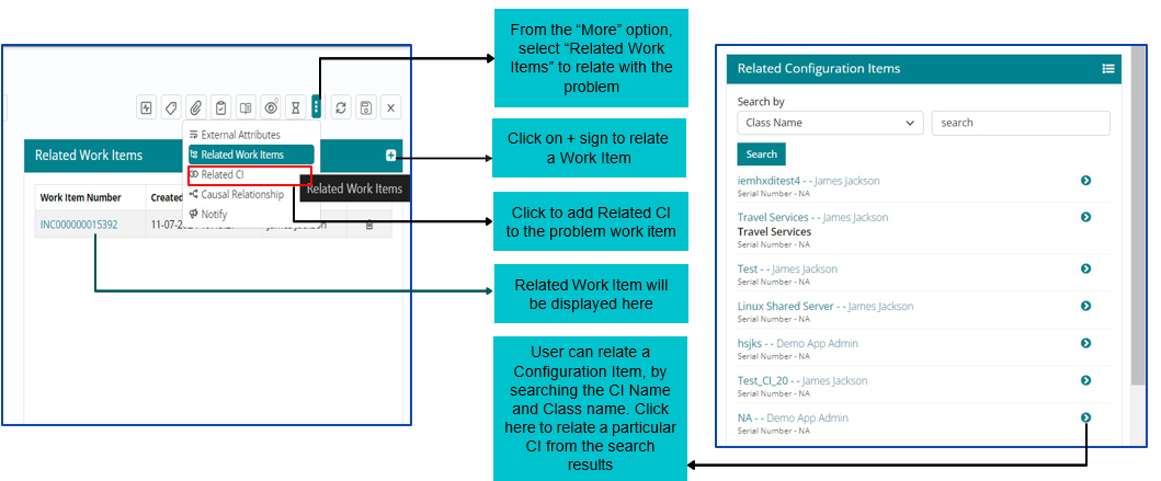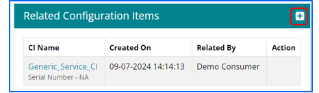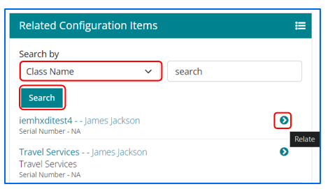 Configuration Items can be searched based on two parameters – CI Name and Class Name. Once the CI list is visible, users can select the CI and click on relate.