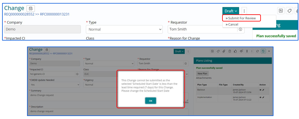 Implementation Plan needs to be reviewed by the Change Manager or any authorized Approving Authority before its being executed by the Change implementer. Once it’s sent for review the lifecycle stage of Change Work Item changes to ‘Under Review’.