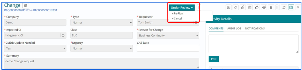 - A Change Work Item can be cancelled, in various stages of a Lifecycle by selecting the ‘Cancel’ option.