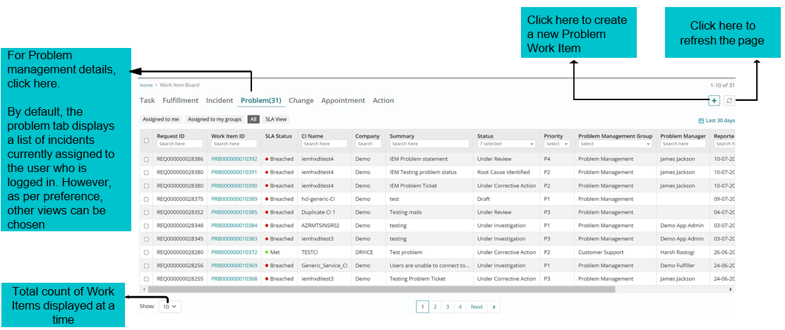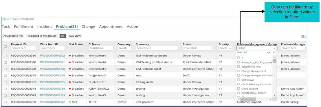 Support users can sort Problem Work Items based on various filters available on the landing page of work item board.