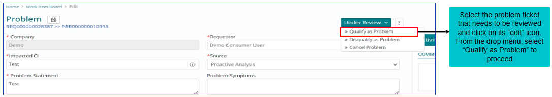 Work Item needs to be reviewed for correctness and consistency by the Problem manager who will have to Qualify as Problem to move ahead with the lifecycle.
