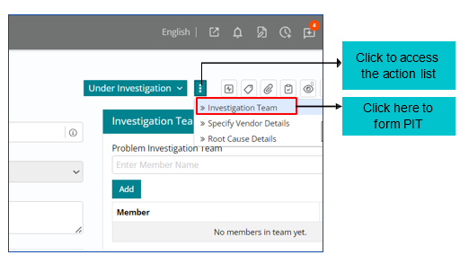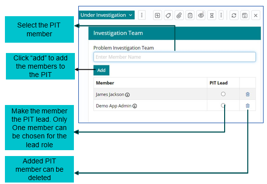 As soon as support user clicks on ‘Investigation Team’ a window will appear on the right where PIT members need to be chosen.