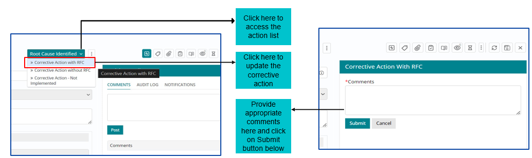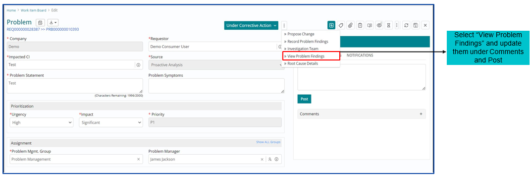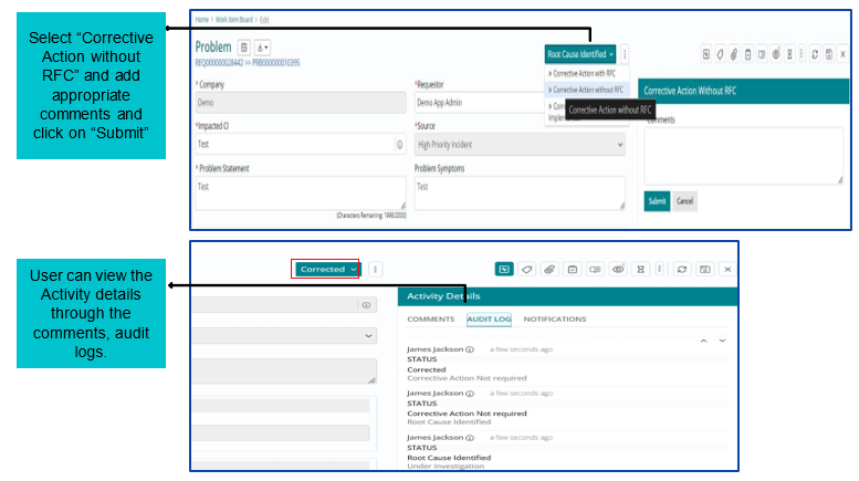 Once RCA is completed, Corrective Action needs to be implemented and captured in the tool. Problem fix can require Change/RFC to be implemented.