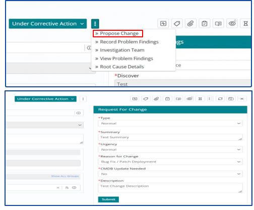 A Change can be proposed to implement the corrective actions for fixing a Problem Work Item. This can be done via a feature available in the tool as shown below.
