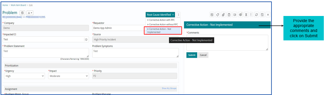 Post adding Root cause Details, user can click on Root Cause Identified option to move forward with the Problem Management Workflow.