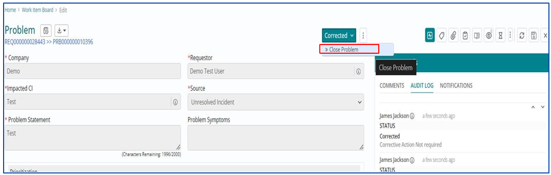Once Change is Implemented and Completed successfully as per the process, the lifecycle of Problem Work Item will move to ‘Corrected’.