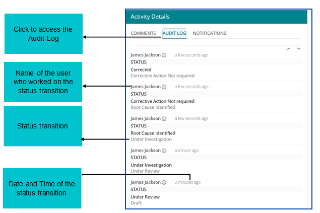 - Audit log captures the changes in various fields throughout the lifecycle of a Change