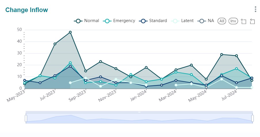 Trend charts are a valuable tool for businesses and organizations of all sizes. Examples include incidents created over time, MTTR over a period. If a user needs to filter for a specific period, they can do the same for the relevant chart using the sub-part below the chart.